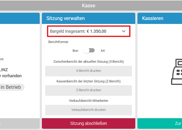 Der errechnete Barbestand der Sitzung ist in den Kasseneinstellungen unter [Sitzung verwalten](https://helpcenter.etron.info/kasse/einstellungen/sitzung-verwalten#umsatz-und-bareinnahme-der-aktuellen-sitzung) sichtbar.